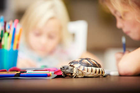 Girls and turtle. Siblings are doing his homework for elementary school.