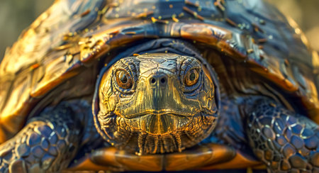 A striking close-up of a turtle nestled in vibrant greenery, showcasing its detailed features and calm demeanor, illuminated by soft sunlight in a peaceful environment.