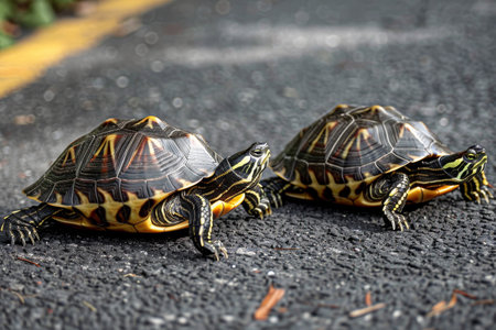 Two turtles on asphalt looking into the distance