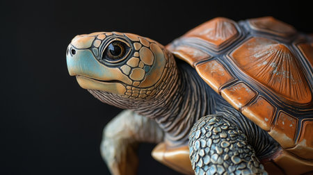 A close-up shot of a turtle, showcasing its detailed shell and textured skin, set against a black background to emphasize its natural beauty.