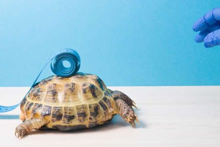 land tortoise and measuring blue tape on its shell, measuring the shell of turtles at a veterinarian's appointment, determining the age of the turtle