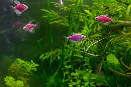 Aquarium with pink colored glofish. Gymnocorymbus ternetzi.