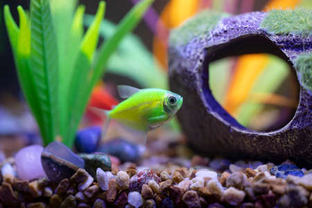 A closeup of a cute green Neon Fish swimming next to an artificial water plants