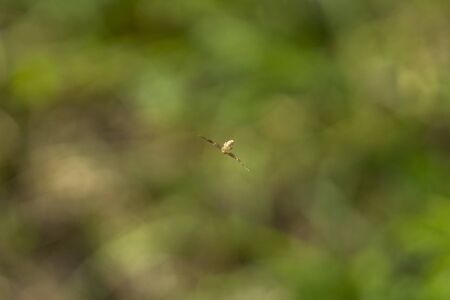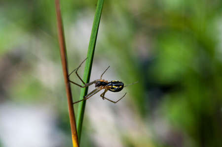 Yellow-black color spider siting on the green grass trees and green background in garden.