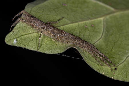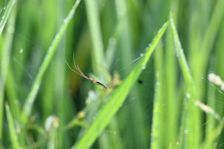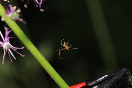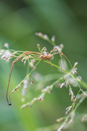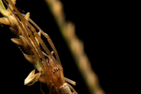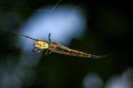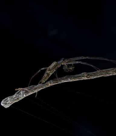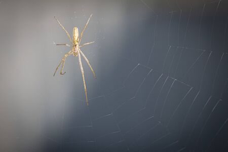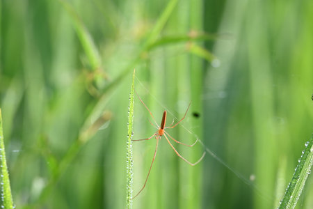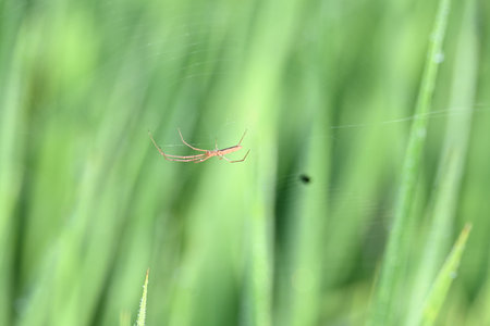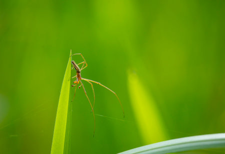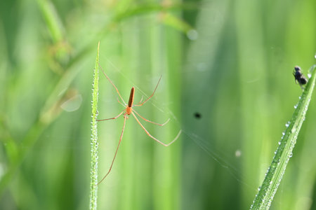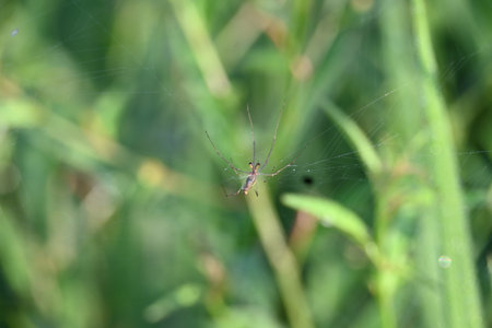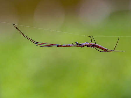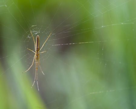 Closeup of a Long-jawed orb-weavers spider genus Tetragnatha, or stretch spider in its habitat.
