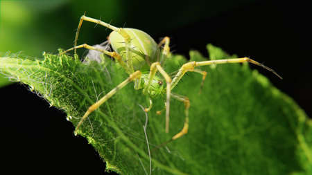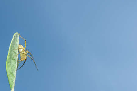 A beautiful small spider sitting on a green leaf in a garden. Seasonal summer scenery in Latvia, Europe.