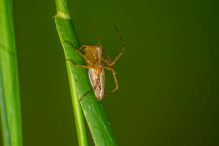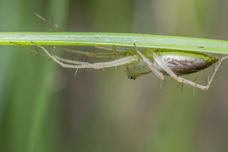 Tibellus oblongus spider. Its common name oblong running spider and slender crab spider. Its spider with a Holarctic distribution. It hunts small insects, which it kills with venom