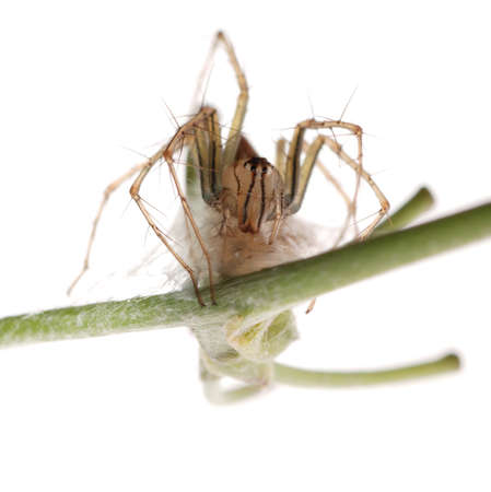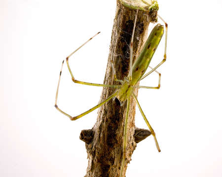 Tetragnatha spider on a twig against a bright white background - extreme macro
