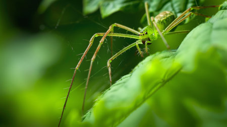 A close-up view of a spider crawling on a green leaf in its natural habitat. The spiders intricate details are visible as it moves gracefully across the surface.
