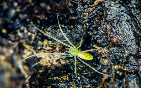 Green long-jawed spider, Tetragnatha yesoensis on the tree bark.