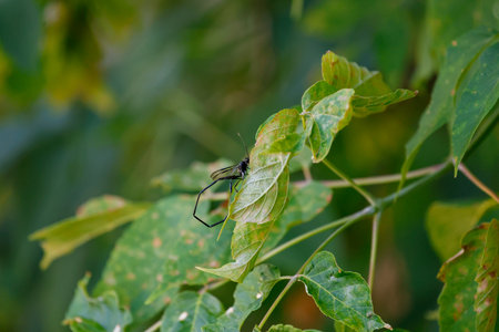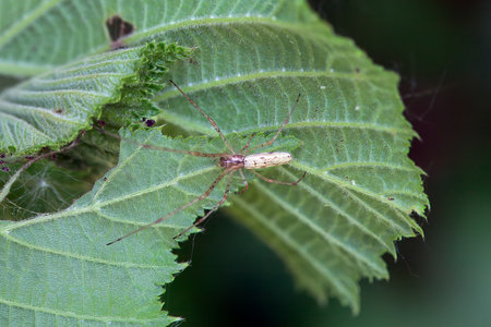 Tetragnatha montana on the termuric green leaf on a summers day.