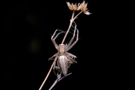 The macro close-up of a spider Linyphia triangularis which hangs on a twig branch