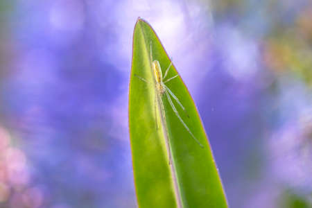 yellow long-legs spider hidden on the leaves, take photos in the natural wild state, Luannan County, Hebei Province, China.
