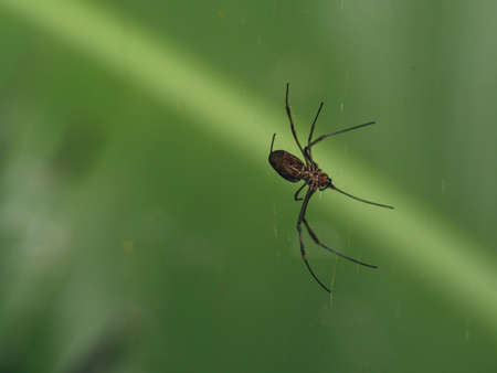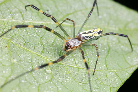 Tetragnatha montana on the termuric green leaf on a summers day.