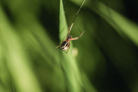The macro close-up of a spider Linyphia triangularis which hangs on a twig branch