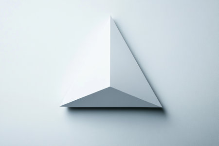 A sleek, white triangular sculpture is positioned against a soft white wall, showing its design with sharp angles and simplicity.