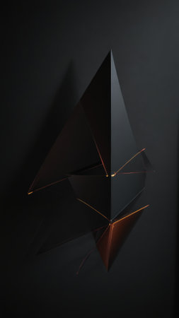 A striking triangular sculpture composed of layered metallic shapes stands in a dimly lit studio. The golden and silver colors are enhanced by a soft glow, creating a captivating visual effect.