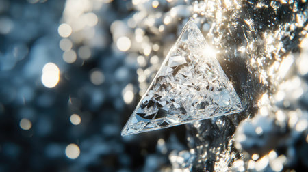 A stunning close-up view of a translucent diamond shaped like a triangle, set against a glittering abstract backdrop, capturing reflections and mesmerizing bokeh effects.