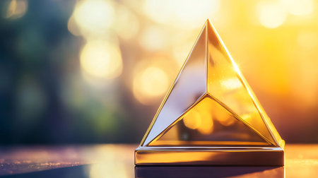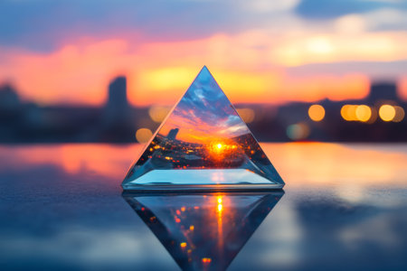 Stunning glass pyramid reflecting blurred sunset city lights on a shiny surface with soft background