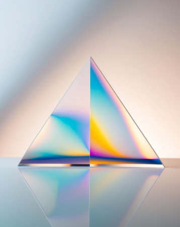 A vibrant transparent pyramid prism showcases a beautiful light spectrum against a soft gray background, creating an artistic and minimalist aesthetic for contemporary art lovers.