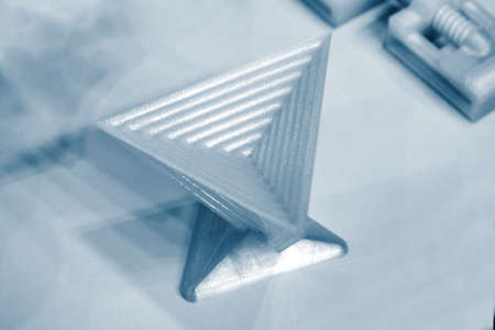 Small model of pyramid printed on 3D printer close-up. Object created on 3D printer from molten plastic. 3D printing technology. Additive modern new progressive technologies. FDM technology Blue color