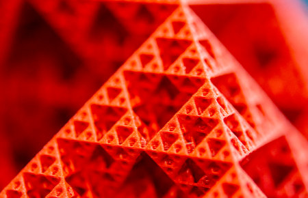Art object printed on 3D printer from red melted plastic close-up. Model of pyramid created on 3D printer from plastic. 3D Printing technology. Additive progressive technology. New modern technologies