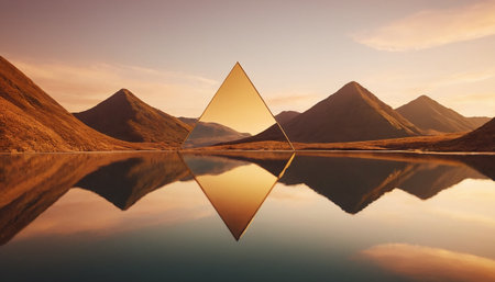 A transparent triangle is positioned, reflecting on calm water mirroring the setting sun. The composition features gradient hues of orange, blue, and yellow. The image presents a clean and balanced arrangement, ideal for conceptual designs, artistic projects, and various commercial applications.
