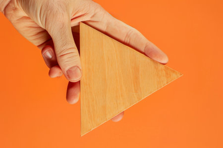 A hand holding a triangle shaped piece of wood on an orange background, AI