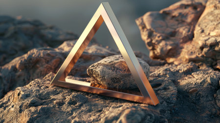 Triangle shape with reflection of mountains and lake. 3D Rendering