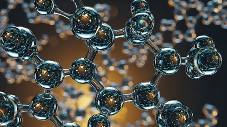 This abstract image captures the intricate beauty of a molecular structure with glass-like spheres, reflecting colorful shades in a modern design.