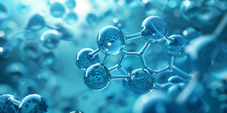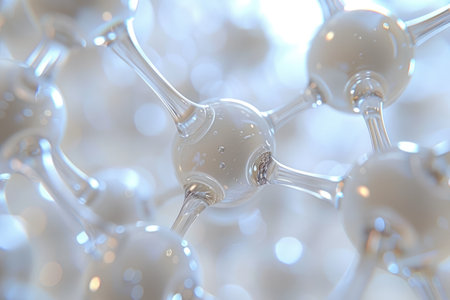 This image showcases a molecular structure composed of interconnected spheres and rods, set against a dark backdrop. The structure is rendered with a glossy appearance, highlighting the connection points. A bokeh effect in the background adds depth. Suitable for scientific publications, educational materials, or use in technology-related projects.
