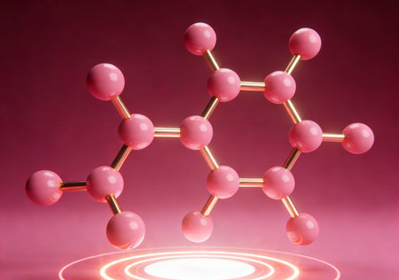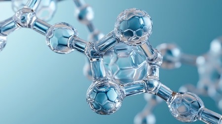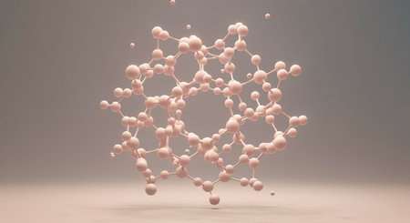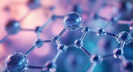 Tiny molecular structure with glowing balls connected by transparent rods against a soft gradient background..