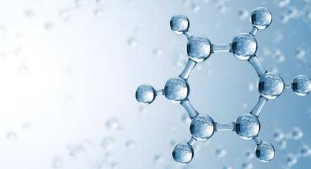 A detailed 3D rendering of a benzene molecule, depicted as a hexagonal ring of interconnected spheres representing atoms. The molecule is set against a soft blue background filled with numerous small, translucent water droplets and bubbles, suggesting a liquid or scientific environment. The lighting highlights the reflective surfaces of the atomic spheres.