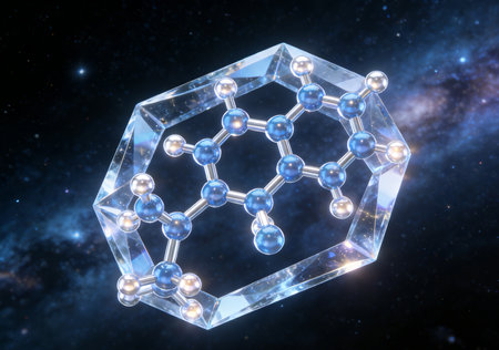 Explore an intricate abstract molecular structure featuring interconnected hexagons and glowing particles, symbolizing innovation and exploration in chemistry and biology.
