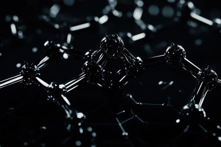 An abstract molecular structure is depicted, showcasing interconnected nodes against a dark backdrop. The image utilizes a focus on the structural forms, featuring a close-up perspective. This visual representation can be suitable for scientific illustrations, educational materials, or use in presentations. It is suitable for commercial and editorial purposes.