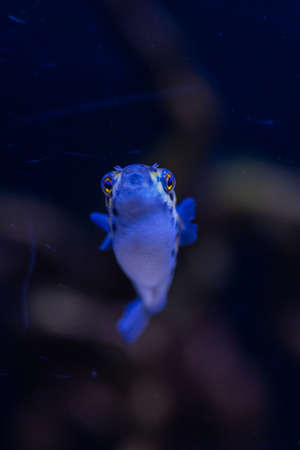 Yellow balloon fish inflated in a marine aquarium. Tropical fish in a coral reef