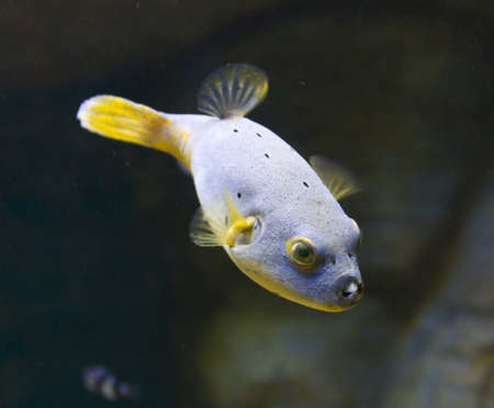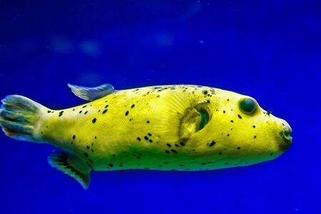 Yellow balloon fish inflated in a marine aquarium. Tropical fish in a coral reef