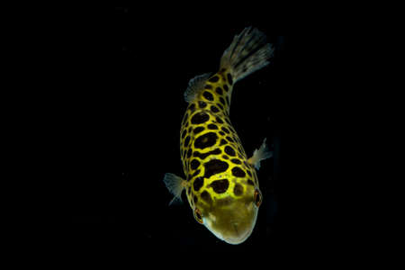 Spotted green pufferfish, tetraodon or Dichotomyctere nigroviridis on black background