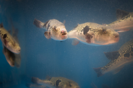 Live Fugu fish in a restauraunt aquarium in Osaka, Japan. Fugu can be lethally poisonous and Fugu sashimi seafood preparation is controlled by law