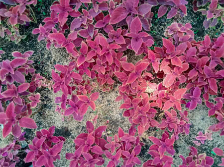 Beautiful nature background with cute white flowers and purple leaves. top view. High quality photo