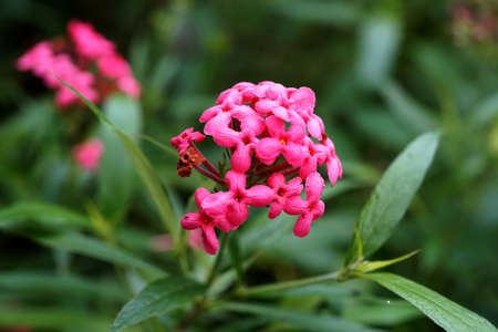 Red Ixora Flower Cluster Blooming in Tropical Garden Close-Up Natural Background Blur Bokeh