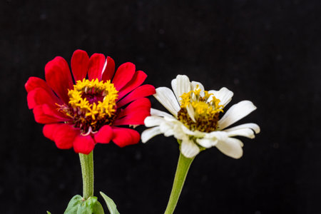 Red and white zinnia flowers isolated on a black background.