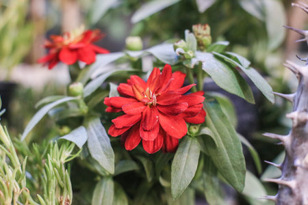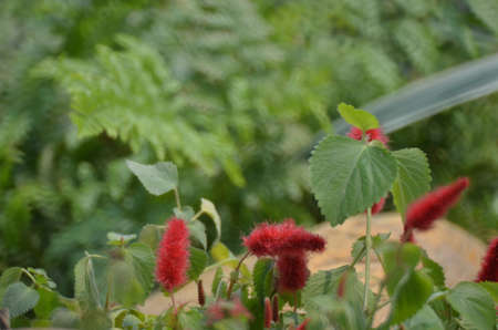 Red decorative flowers with sharp spikes growing in summer park.