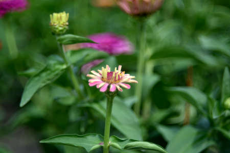 Common zinnia (Zinnia violacea syn. Zinnia elegans) in rural garden close view