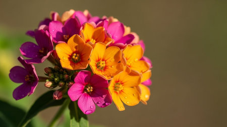 Macro shot of a cluster of small pink and orange flowers adorned with tiny water droplets.