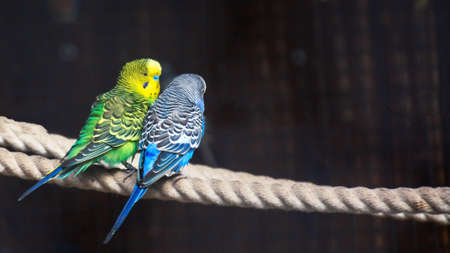 Close-up of blue, green budgie birds sitting on a rope in an aviary