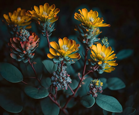 Stunning close-up of vibrant yellow and red flowers against a dark teal backdrop. A beautiful floral composition.