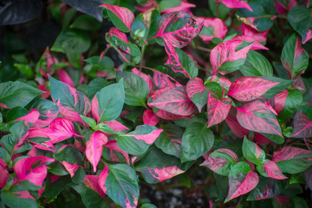 Codiaeum variegatum (Croton) beautiful, stunning plants growing in the sunny meadow green. Garden decoration. Red color leaves.