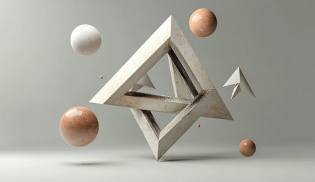 A three-dimensional geometric figure composed of triangles and squares, with several spheres floating around it. The background is gray. In the center, there's an abstract star shape made up of white triangles and brown or pink circles, all floating in space. It resembles an art installation or architectural design. --ar 26:15 --v 6.1 Job ID: 47b52506-bc7d-4f34-b484-af91f7edbf0f