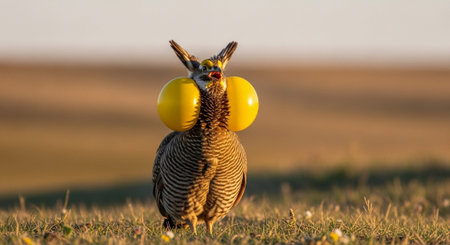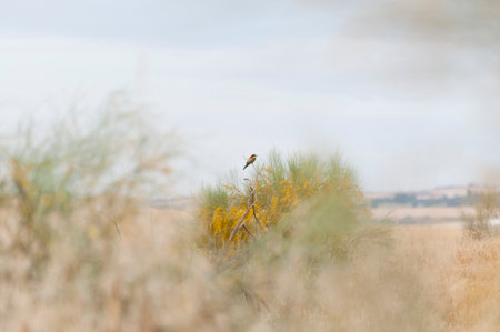A vibrant bird sits atop a shrub, surrounded by a soft, blurred landscape under a cloudy sky, creating a tranquil mood.